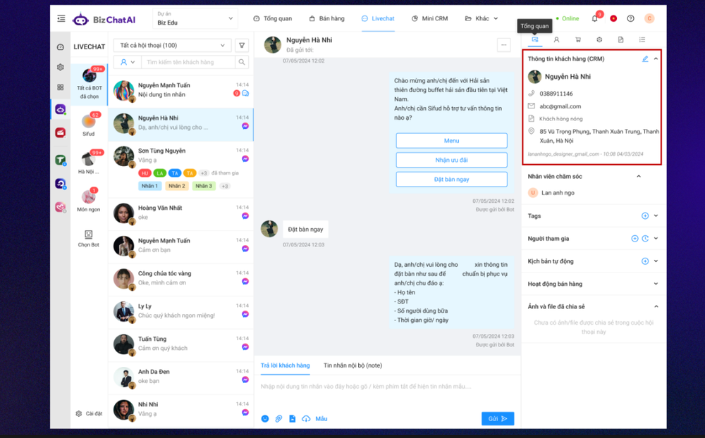 MTV OM chuẩn hóa dữ liệu booking và tự động đặt bàn từ fanpage với CRM - Chat - Call Center của Bizfly