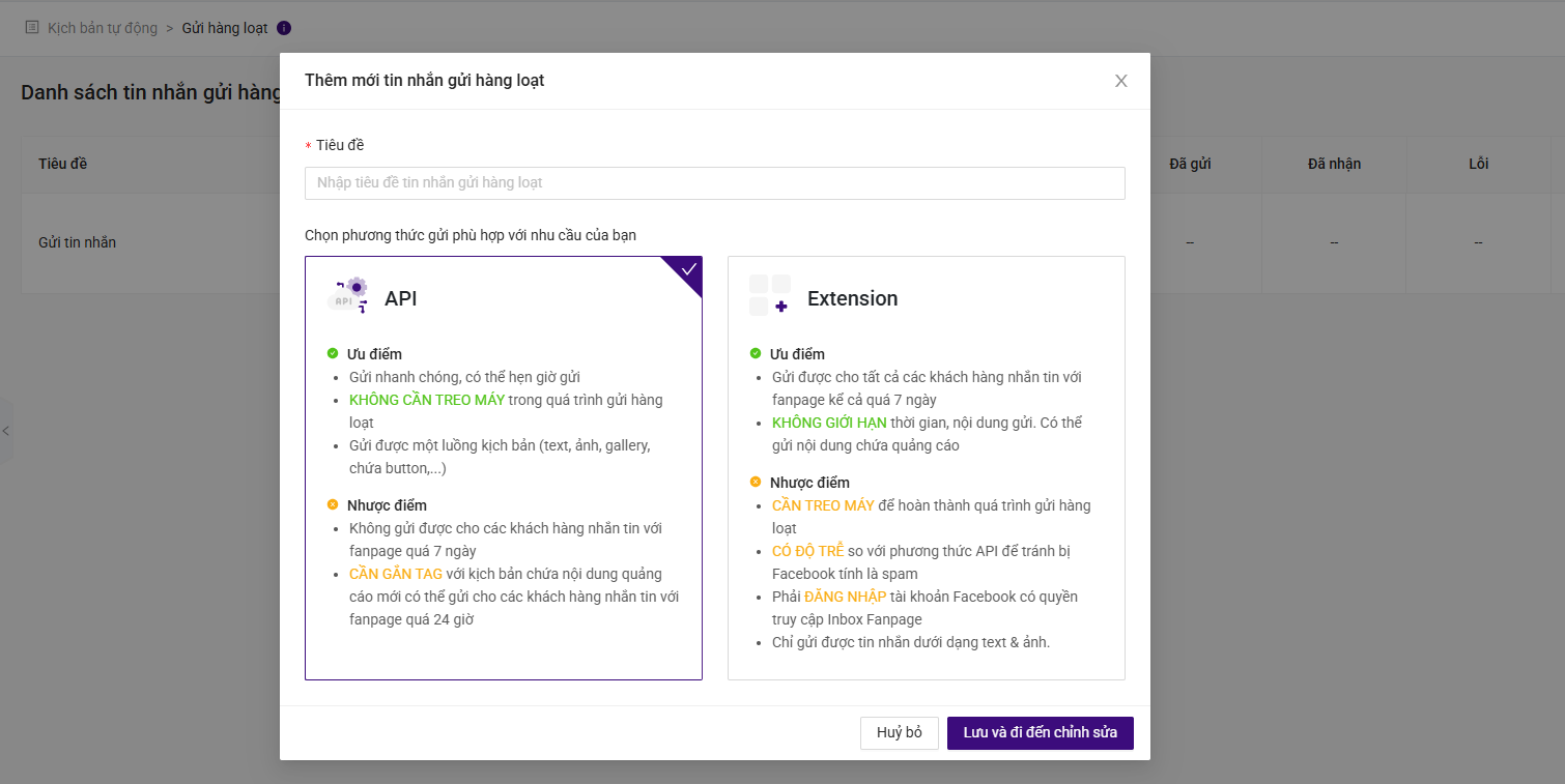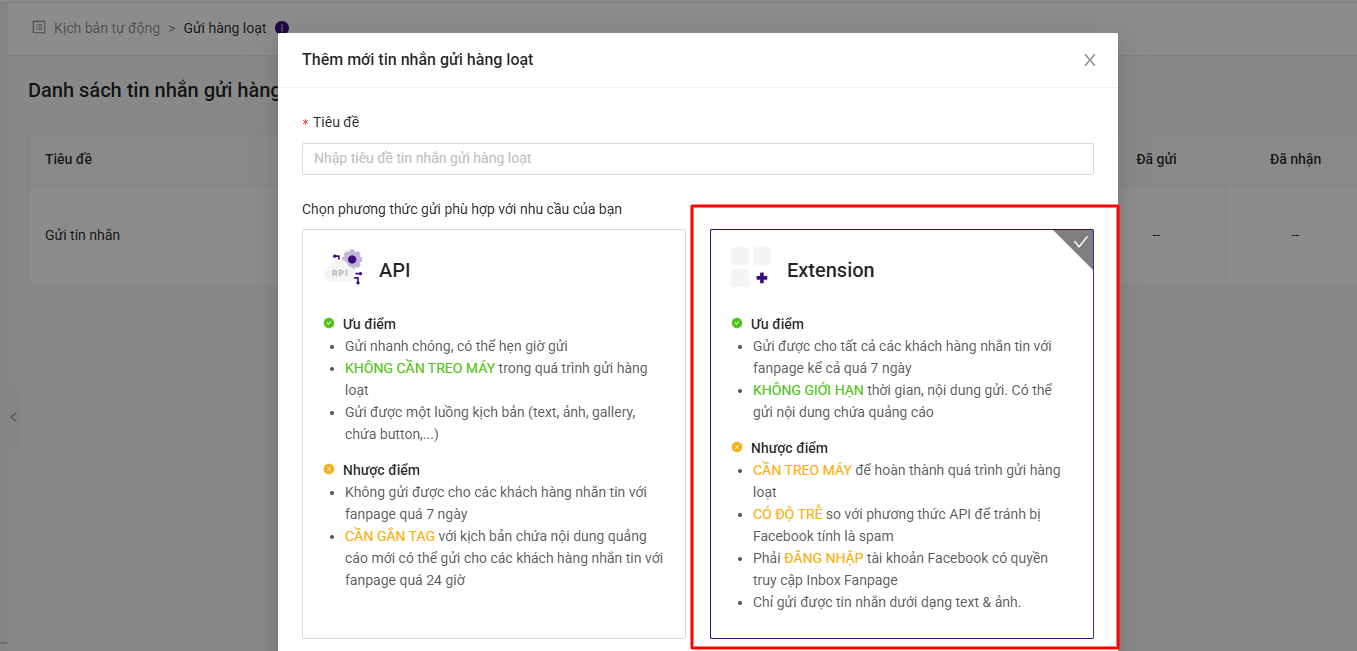 - Nhược điểm: Không gửi được cho khách hàng đã nhắn tin với fanpage quá 7 ngày