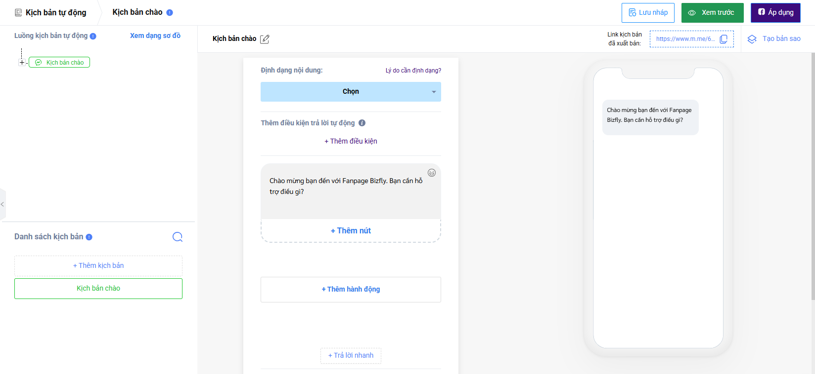 Khi khách hàng inbox đến bot lần đầu tiên, kịch bản chào sẽ là lời giới thiệu đầu tiên của doanh nghiệp. Nội dung kịch bản chào có thể tùy chỉnh linh hoạt để phù hợp với từng thương hiệu, ngành hàng, hoặc các chiến dịch đang diễn ra.