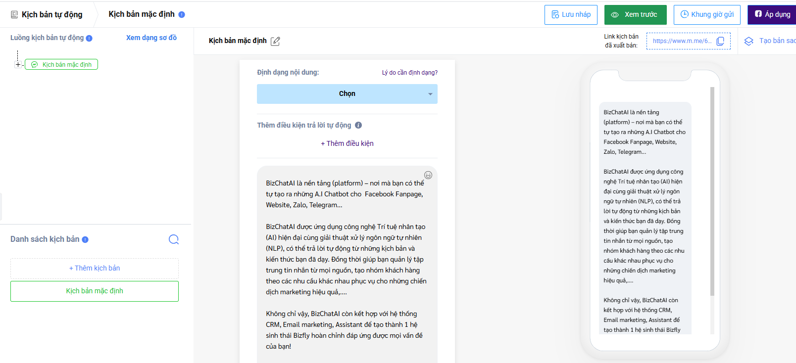 Một chatbot không thể tạo chuyển đổi nếu không có kịch bản phản hồi phù hợp. Tính năng Quản lý kịch bản của BizChatAI được xây dựng nhằm giúp doanh nghiệp biến chatbot thành một trợ lý thực thụ, biết chào hỏi, biết gợi ý, biết chăm sóc đúng lúc, và biết lắng nghe đúng cách.