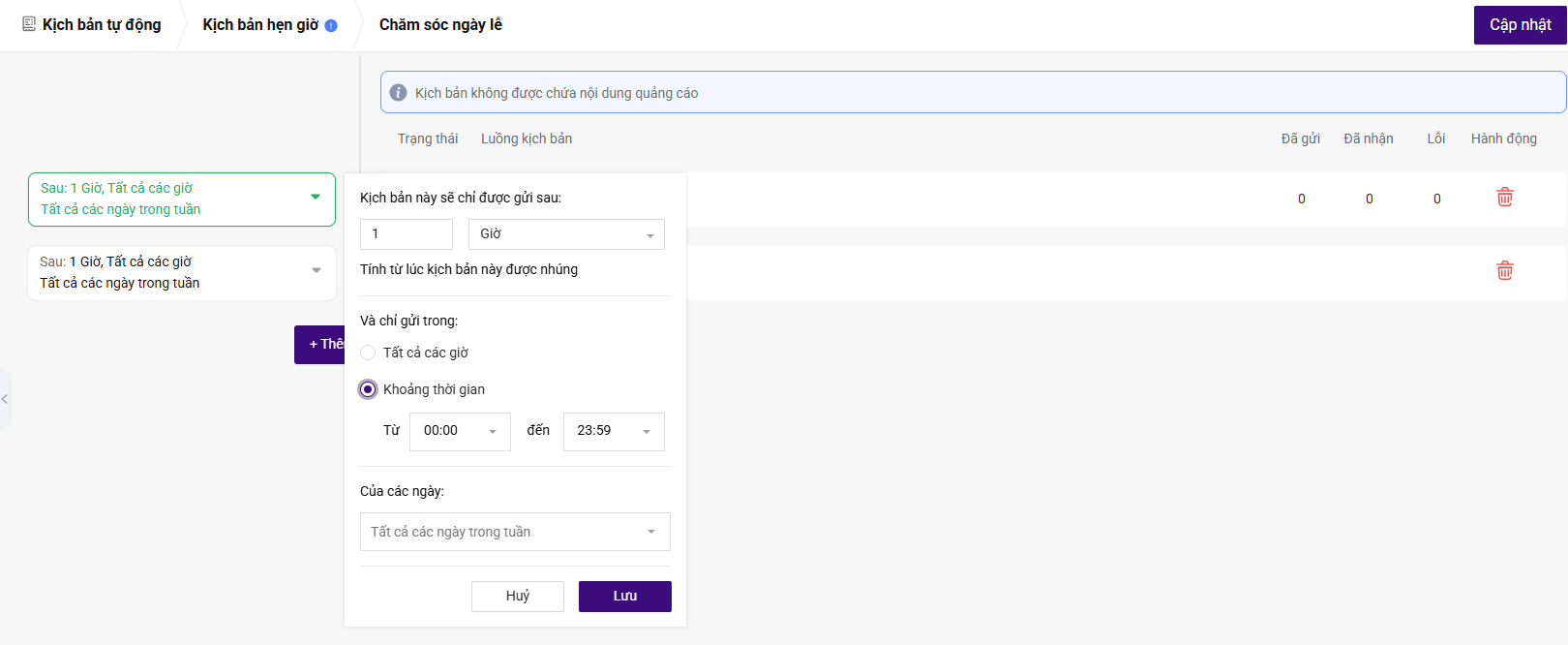 Cho phép gửi một hoặc nhiều kịch bản cho một nhóm khách hàng vào thời gian định trước (giống như gửi tin nhắn marketing). Bạn có thể thêm/sửa/xóa các bộ kịch bản hẹn giờ, theo dõi số lần gửi, trạng thái gửi thành công/thất bại.