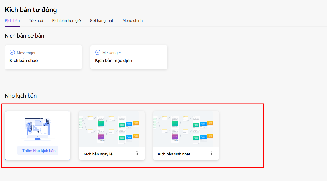 Kho kịch bản là nơi lưu trữ tập trung tất cả các nhóm kịch bản, bao gồm: chào hỏi, mặc định, từ khóa, hẹn giờ,... Người dùng có thể: