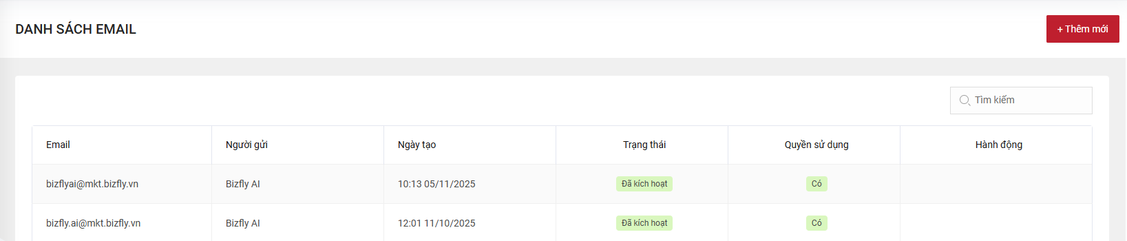- Hành động: Thực hiện các thao tác nhanh chóng như chỉnh sửa, xóa hoặc sao chép cấu hình email, giúp tối ưu quy trình vận hành và triển khai chiến dịch.