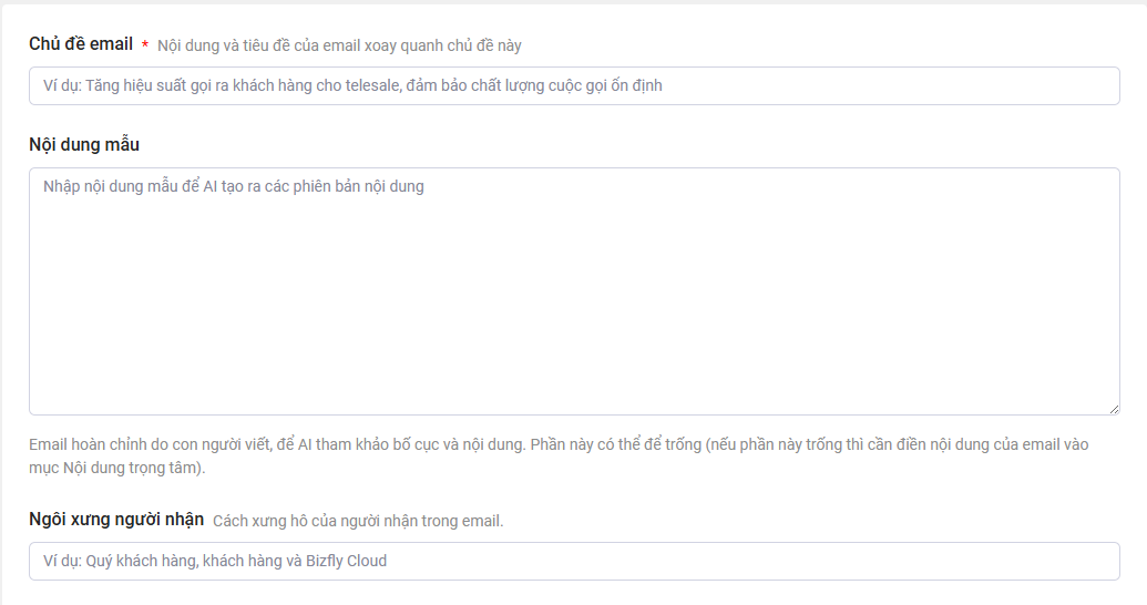 Nếu người dùng không nhập nội dung mẫu, AI sẽ lấy dữ liệu chính từ Nội dung trọng tâm để xây dựng email từ đầu.