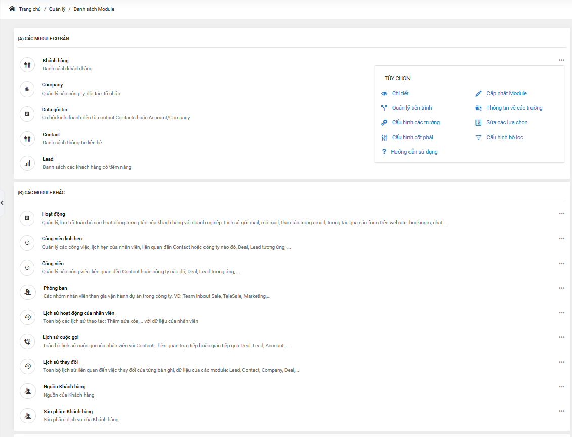 Trên BizCRM, Cấu hình tùy chỉnh là khả năng thiết kế lại giao diện, trường dữ liệu và quy trình nghiệp vụ mà không cần dùng đến code (No-code). Hệ thống cho phép quản trị viên tự thực hiện các thay đổi ngay trên giao diện người dùng, giúp CRM luôn sẵn sàng thích nghi với sự tăng trưởng và thay đổi của doanh nghiệp:
