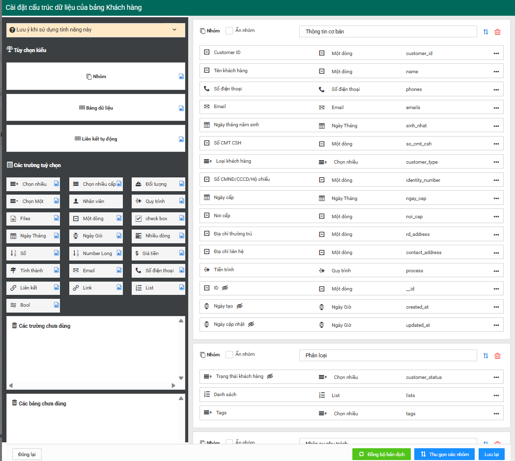 Trường dữ liệu không giới hạn: Tự tạo mới, chỉnh sửa hoặc ẩn/hiện các trường thông tin như: text, số, dropdown, ngày giờ... giúp dữ liệu luôn chuẩn hóa và đầy đủ.