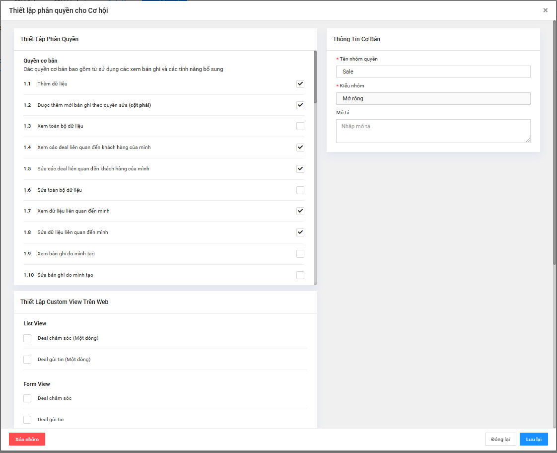 Phân quyền chi tiết: Kiểm soát chặt chẽ quyền xem, sửa, xóa hoặc xuất dữ liệu đến từng trường thông tin nhỏ nhất.