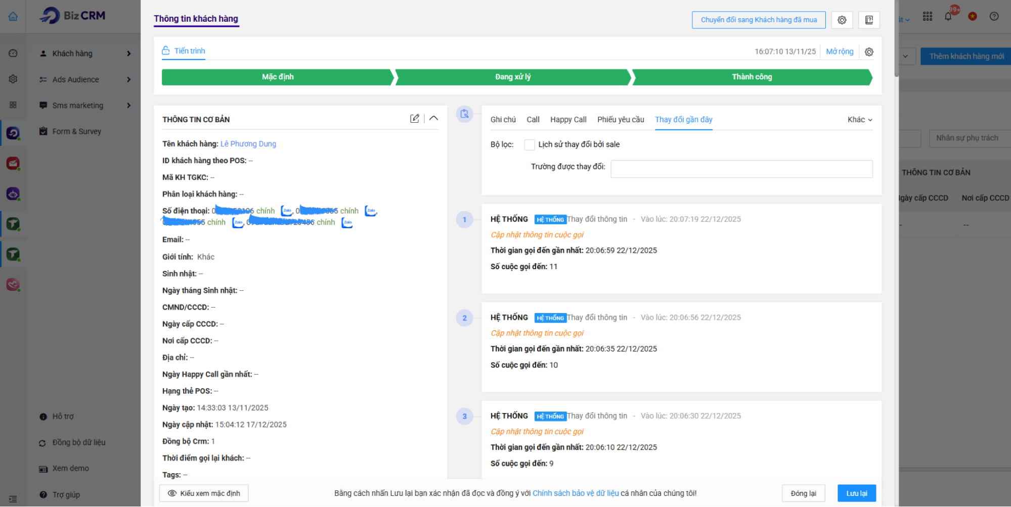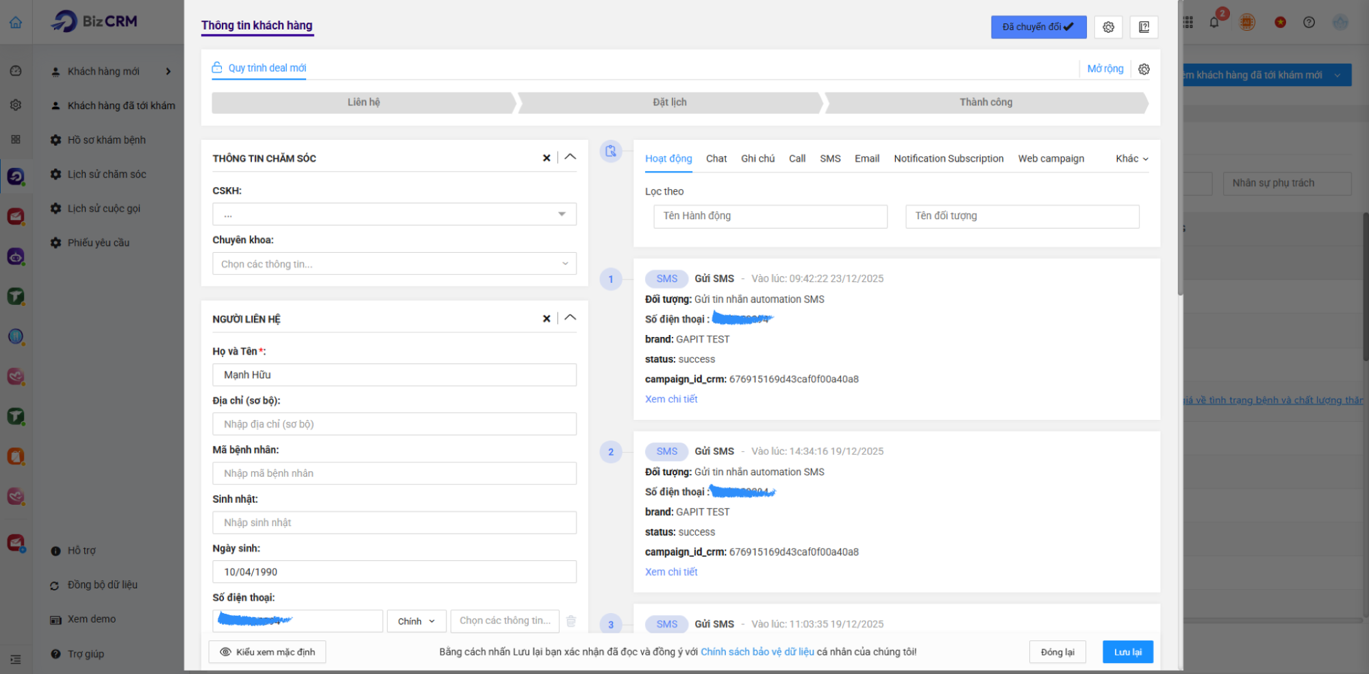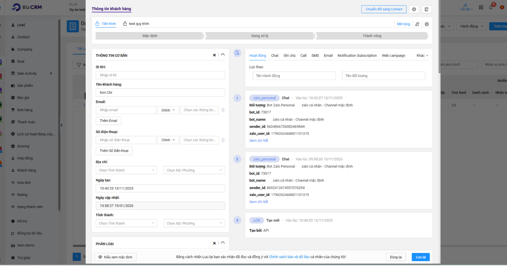 BizCRM không chỉ lưu trữ dữ liệu tĩnh, mà còn liên tục làm giàu hồ sơ khách hàng bằng cách bổ sung hành vi, lịch sử tương tác và các thông tin phát sinh trong quá trình vận hành. Điều này giúp hồ sơ khách hàng luôn sẵn sàng để khai thác trong các hoạt động phân tích, tự động hóa và cá nhân hóa.