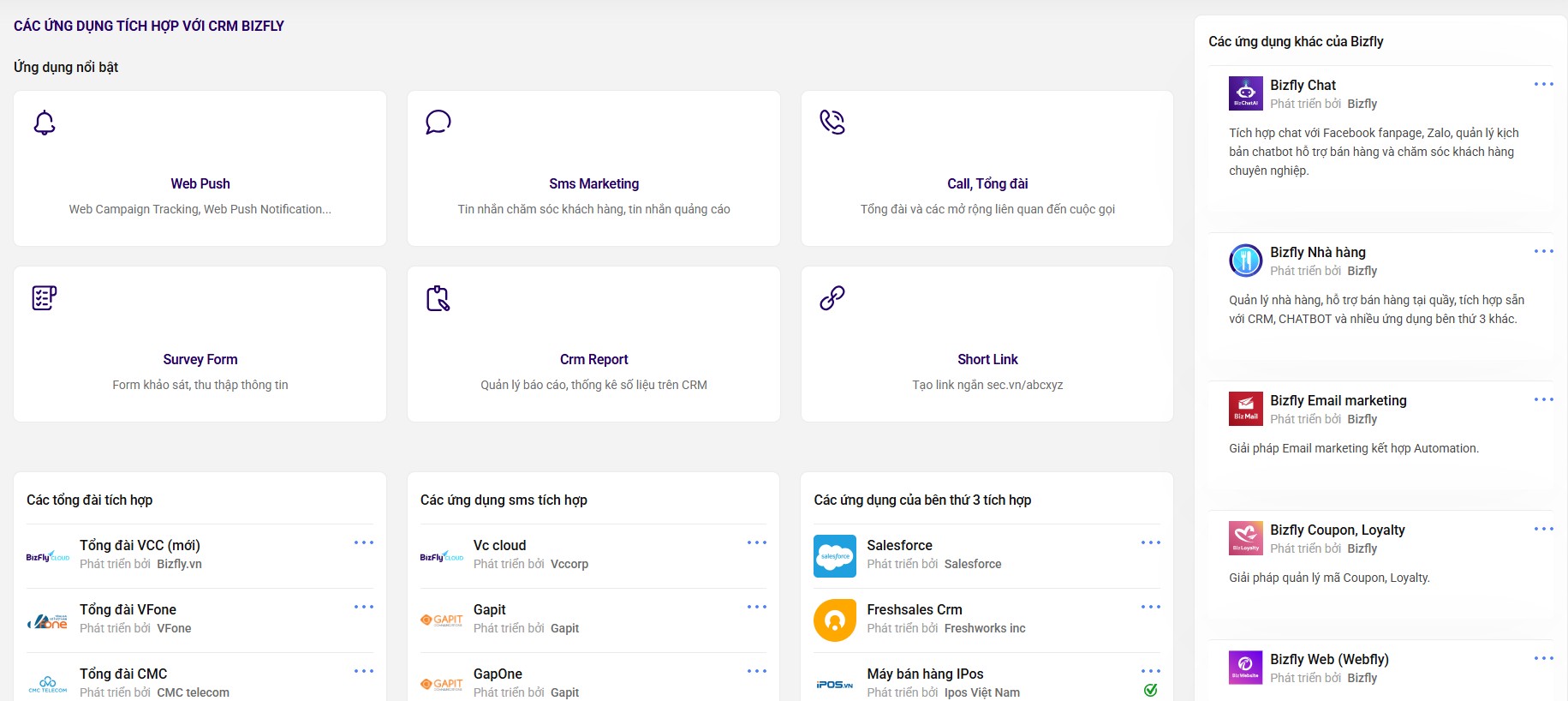 Tổng đài / Call Center: Thông tin cuộc gọi và lịch sử liên hệ được lưu trực tiếp trong BizCRM, giúp quản lý hoạt động chăm sóc tập trung.