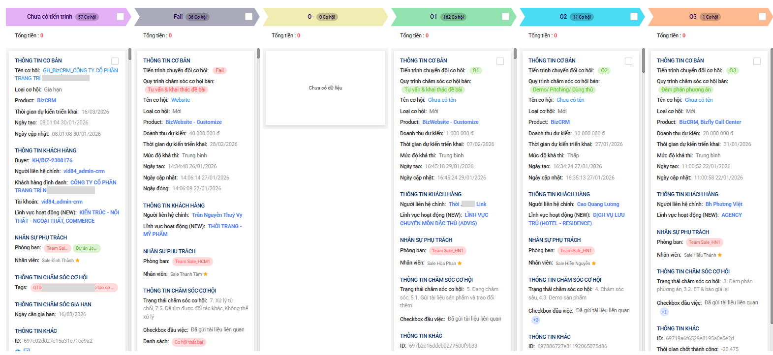 Trực quan hóa "phễu" bán hàng: Theo dõi hành trình khách hàng qua từng giai đoạn (Tiếp cận, Tư vấn, Demo, Báo giá...) một cách rõ ràng.