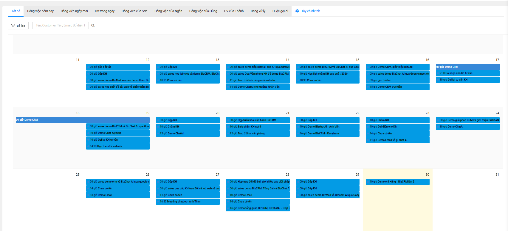 Tự động hóa lịch trình: Lên lịch gọi điện, gặp gỡ hay gửi email follow-up ngay trên BizCRM để đảm bảo mọi khách hàng đều được chăm sóc đúng lúc.