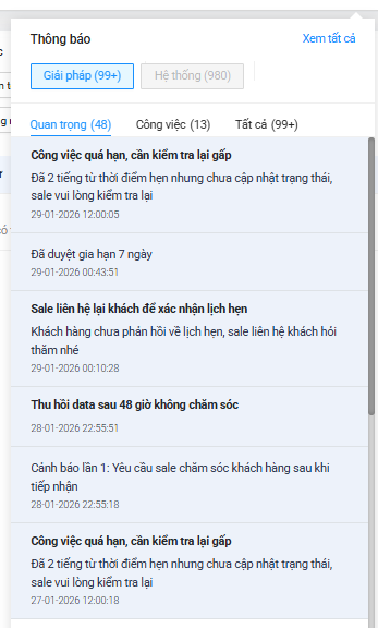 Hệ thống nhắc việc: Tự động gửi thông báo nhắc lịch, giúp đội ngũ sales luôn theo sát khách hàng theo đúng ngữ cảnh đã được lưu trữ trong hồ sơ 360°.