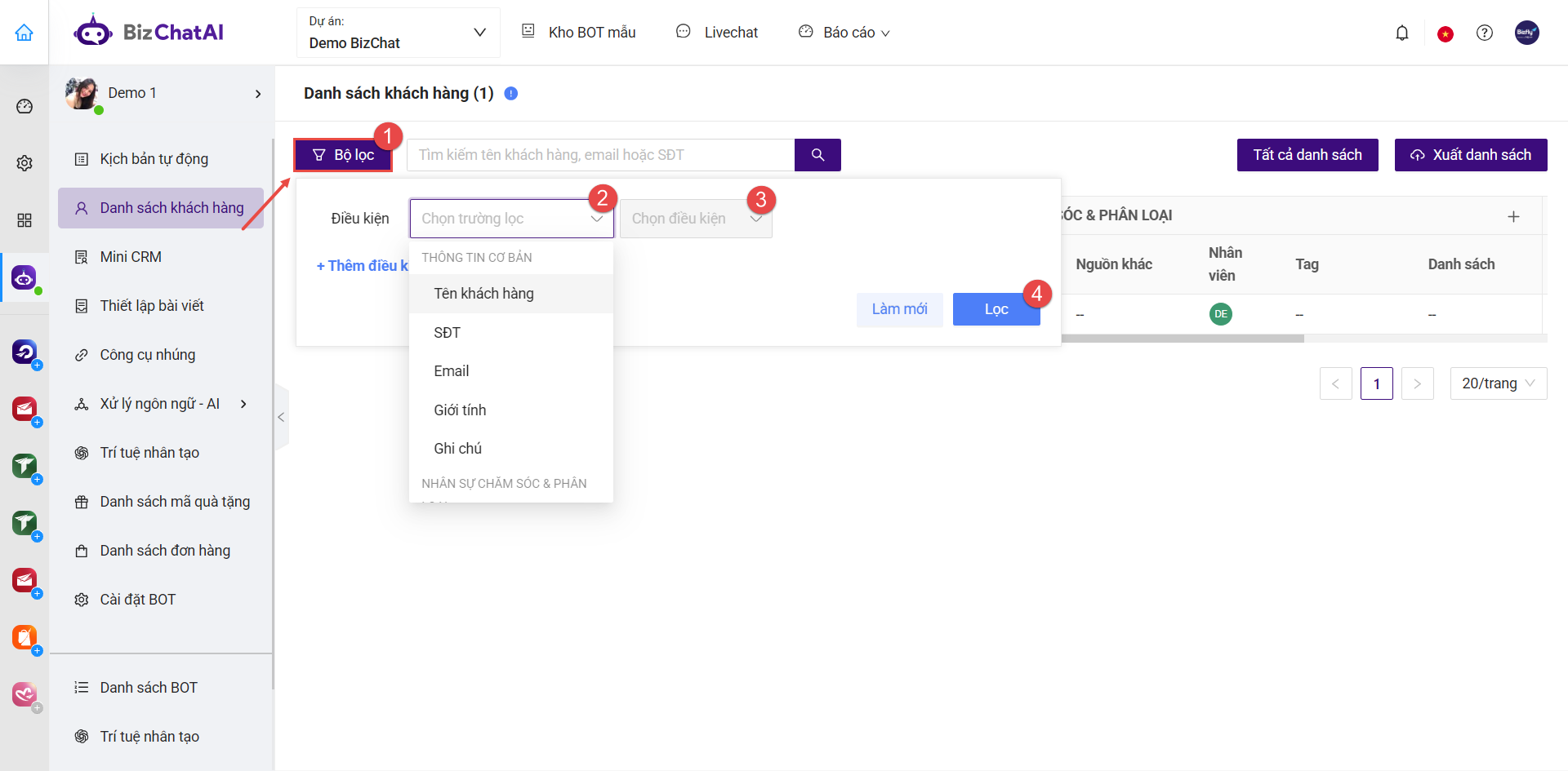 Người dùng chọn Bộ lọc => Chọn trường lọc => Chọn điều kiện để lọc => Bấm Lọc