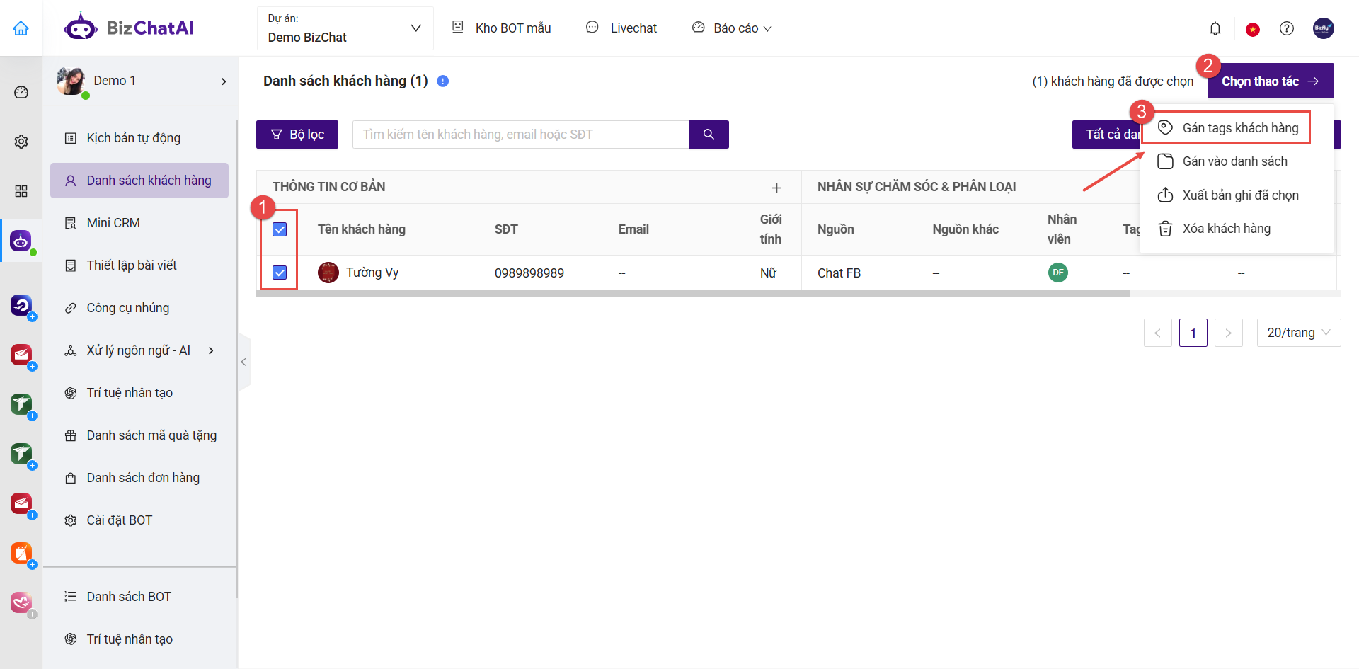 - Bước 1: Người dùng lựa chọn những khách hàng cần gắn tags => Chọn thao tác => Gán tags khách hàng