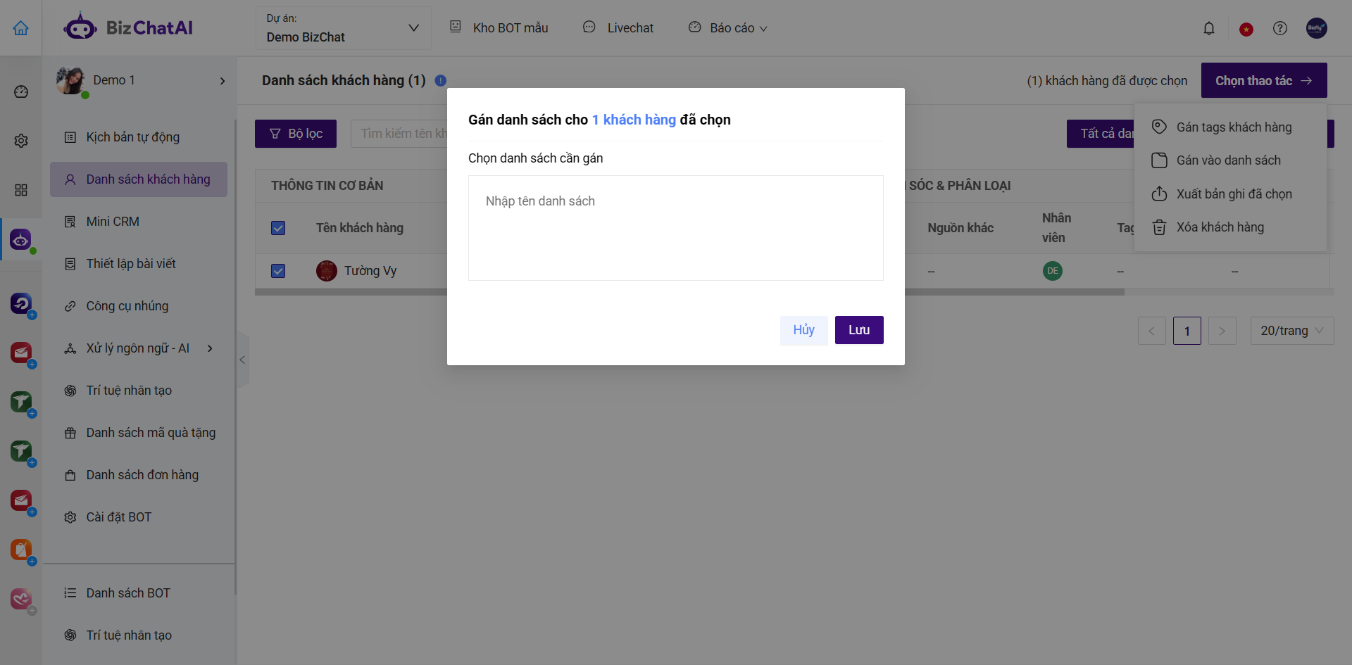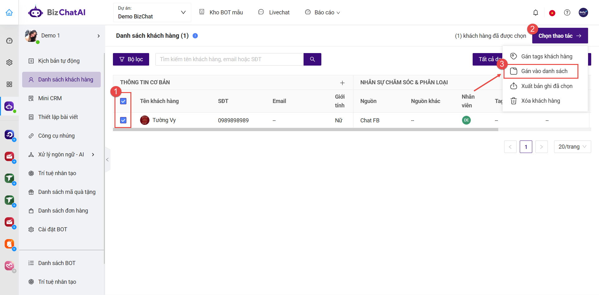 - Bước 1: Người dùng lựa chọn những khách hàng cần gắn danh sách => Chọn thao tác => Gán vào danh sách