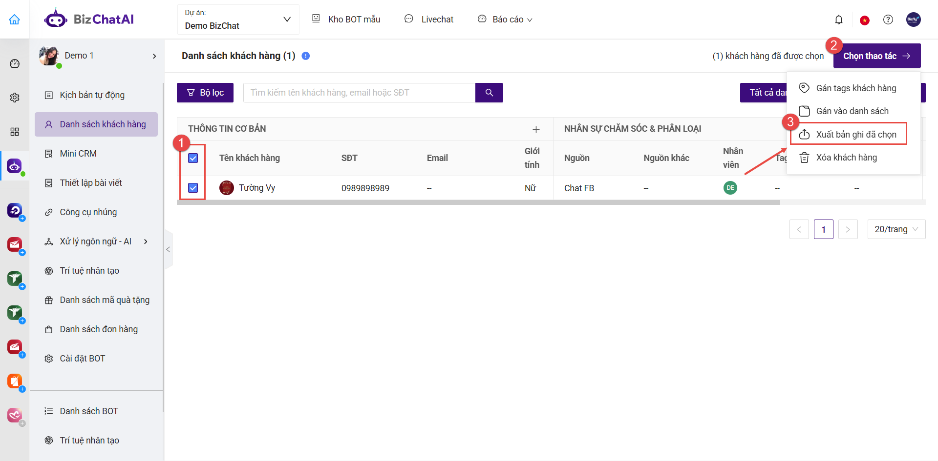 - Bước 1: Người dùng chọn những khách hàng cần xuất ra excel => Chọn thao tác => Xuất bản ghi đã chọn