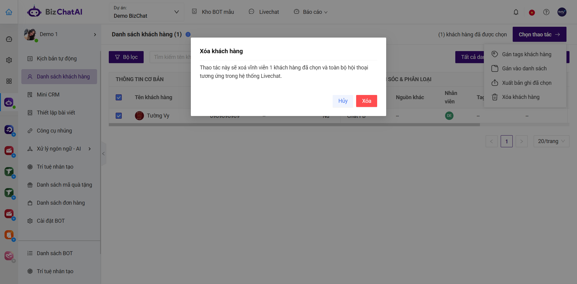 - Bước 1: Người dùng chọn những khách hàng cần xóa => Chọn thao tác => Xóa khách hàng