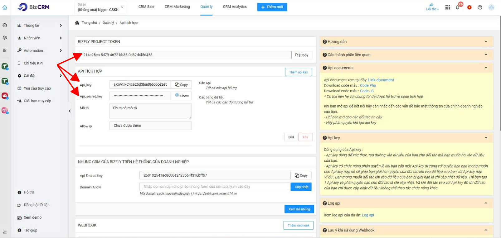 Khi tích hợp Tổng đài với giải pháp Bizfly CRM, Quý khách cần cung cấp cho bộ phận Tổng đài 3 thông tin gồm: API Key, Secret Key và Project Token từ hệ thống CRM để cấu hình kịch bản cuộc gọi.
