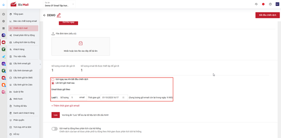 Lưu ý: Khi gửi email anh chị nên bật "Gửi mail tự động theo phân tích của hệ thống " thì hệ thống sẽ phân tích đối tượng khách hàng để phân thời gian gửi hợp lý tăng tỷ lệ đọc email.