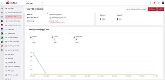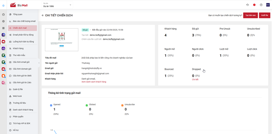 Tại cửa sổ Chi tiết chiến dịch, người dùng có thể xem được toàn bộ thông tin về chiến dịch, bao gồm các kết quả của chiến dịch... Các mục cụ thể như sau: