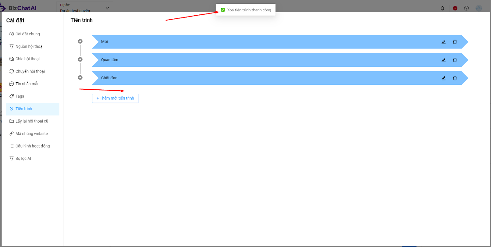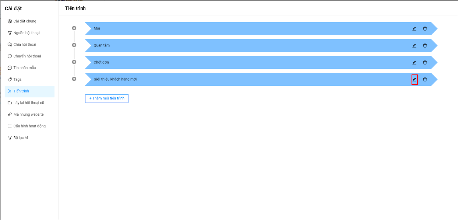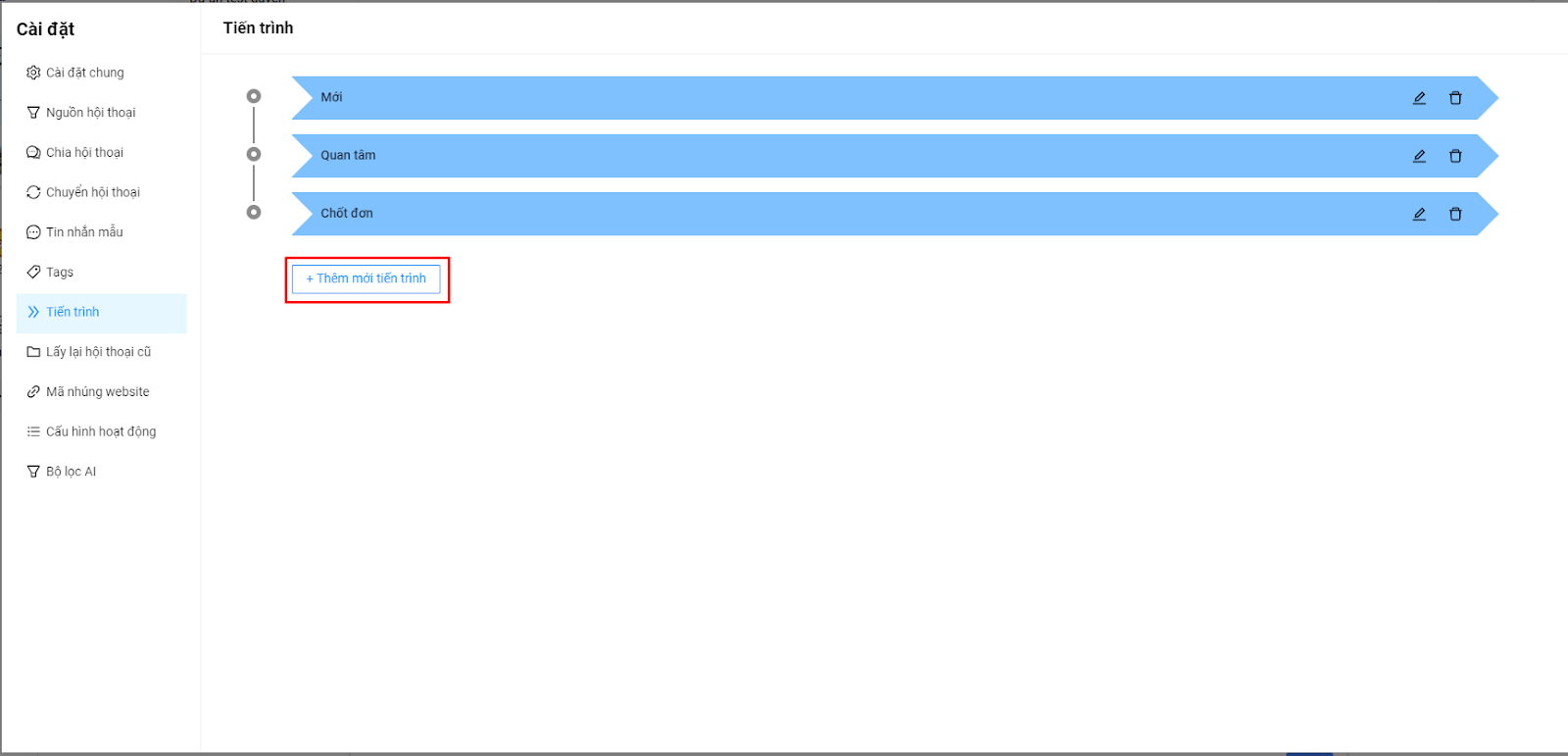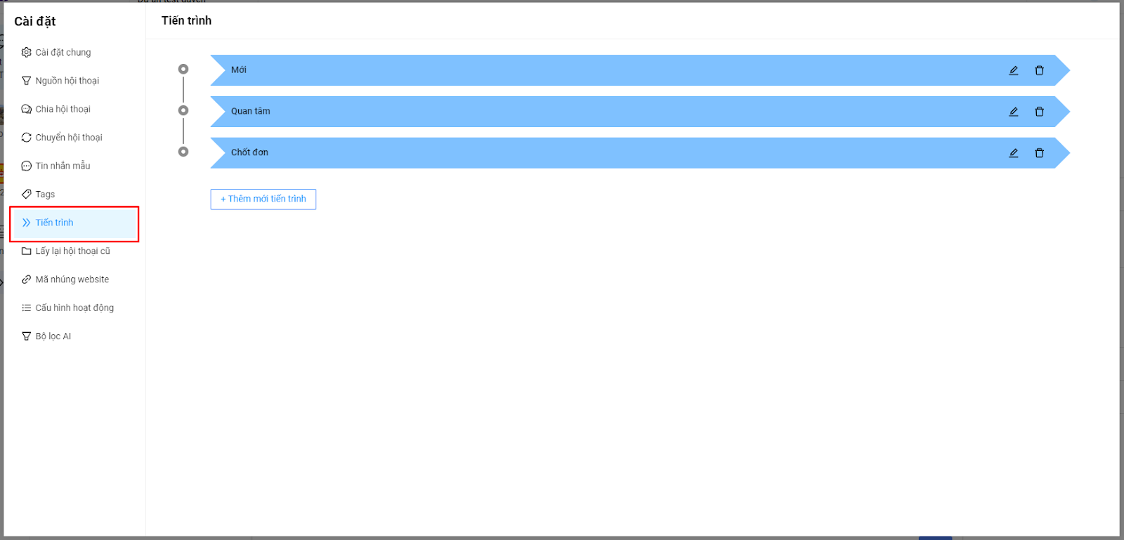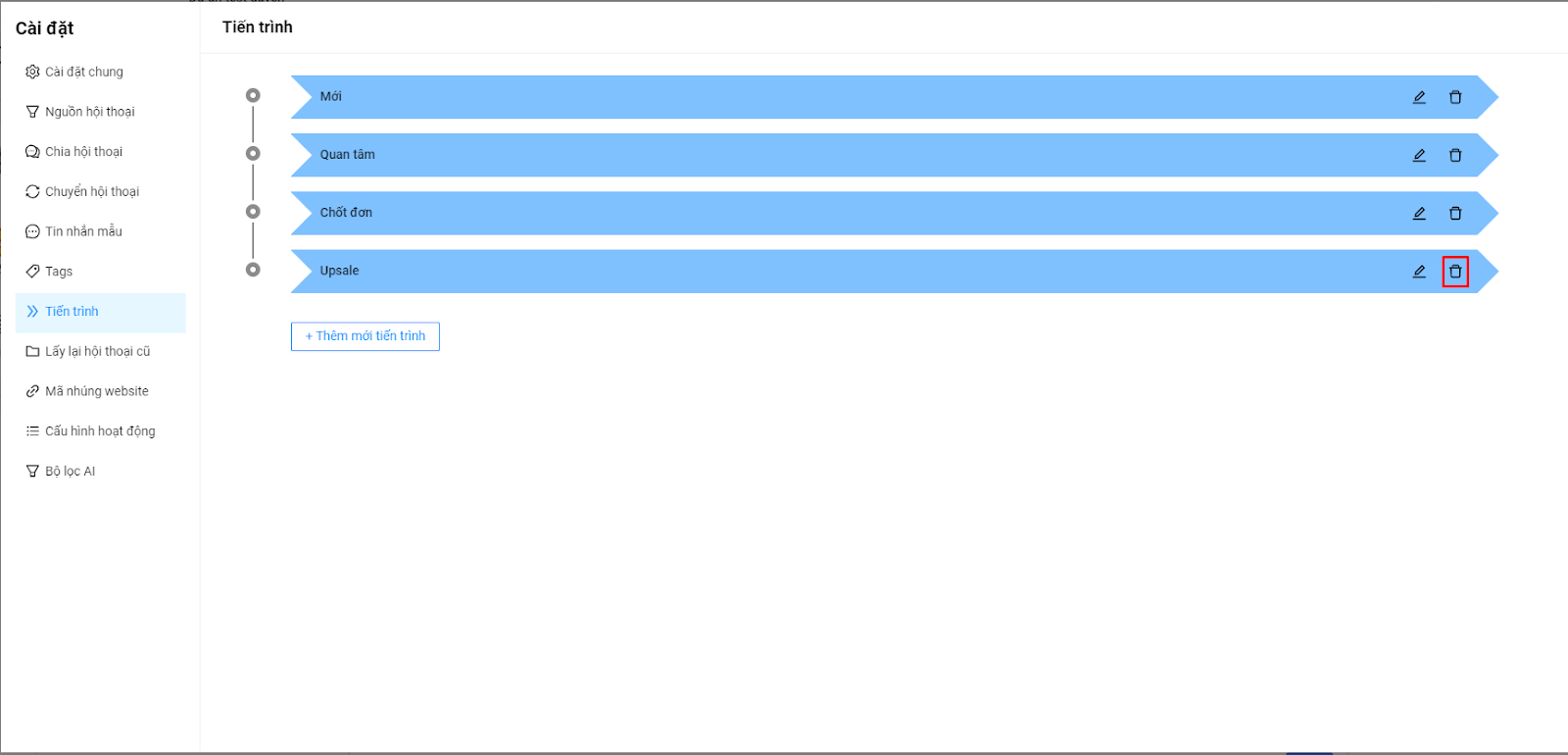 Lưu ý: Khi xóa tiến trình, thanh tiến trình trên hội thoại của khách hàng sẽ update theo tiến trình mới, xóa tiến trình vừa chọn.