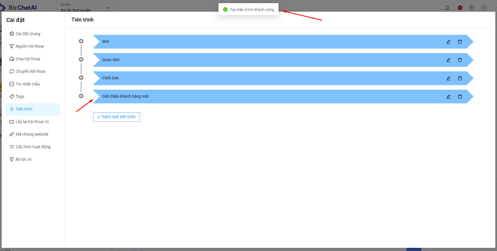 Sau khi tạo mới sẽ có thông báo Tạo tiến trình thành công đồng thời tiến trình mới vừa tạo được thêm vào phía dưới cùng trong danh sách. Thanh tiến trình ở hội thoại của khách hàng cũng lập tức được thêm 1 mục.