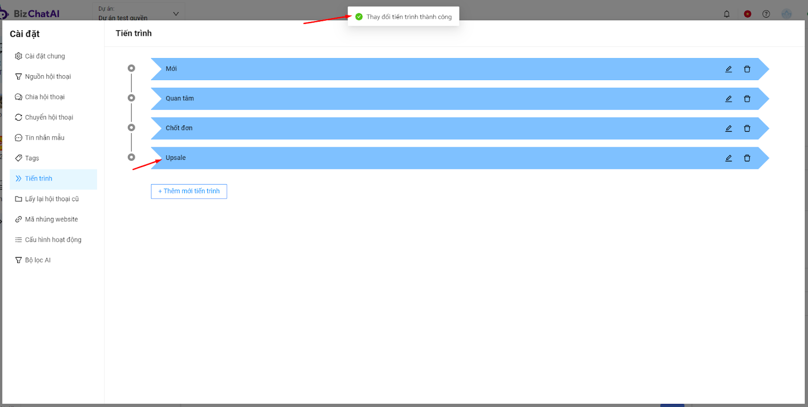 Bước 3: Sau khi thay đổi sẽ có thông báo Thay đổi tiến trình thành công đồng thời đổi tên của tiến trình vừa chọn trong danh sách. Thanh tiến trình ở hội thoại của khách hàng cũng được update theo thông tin vừa chỉnh sửa.