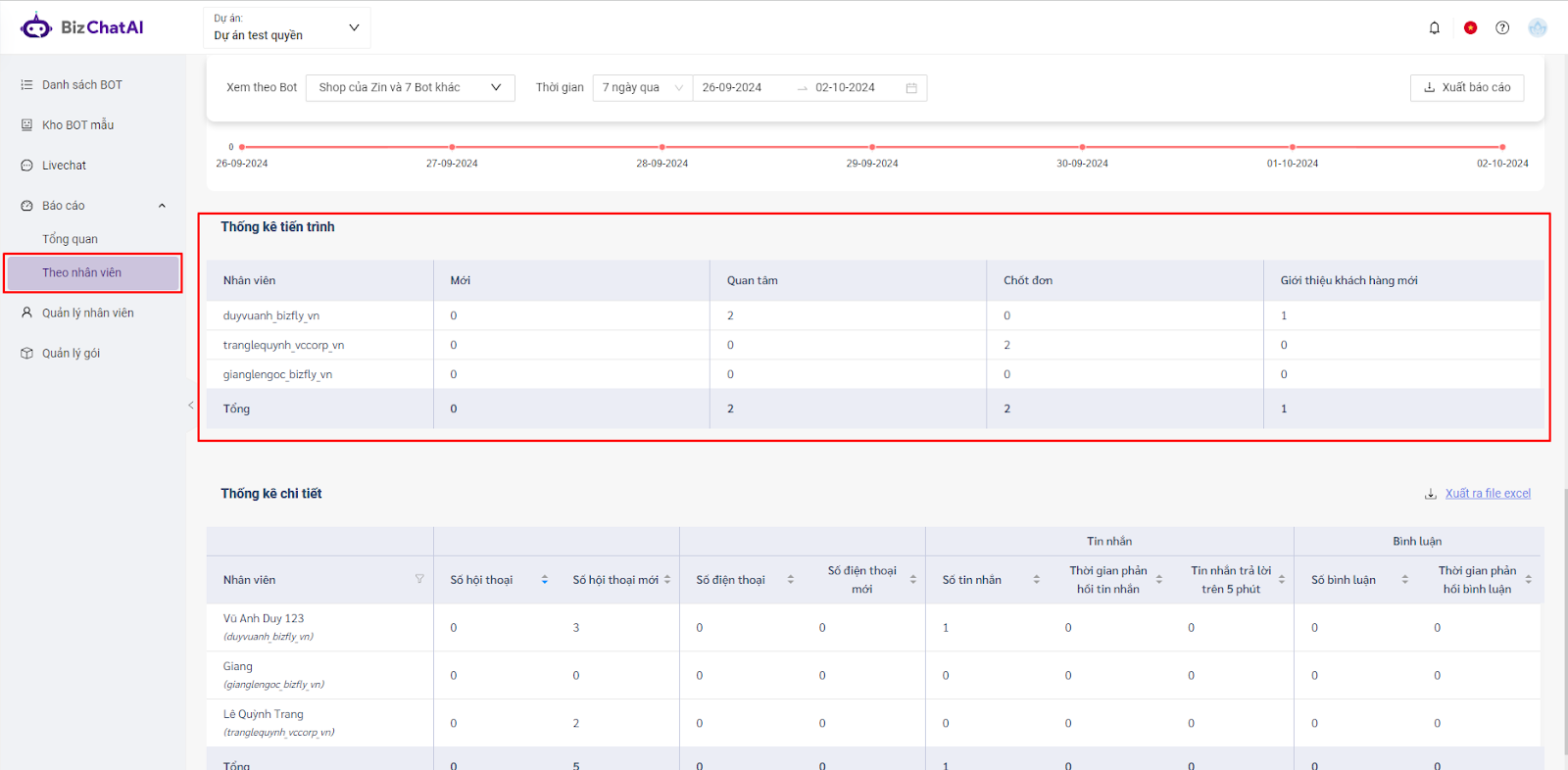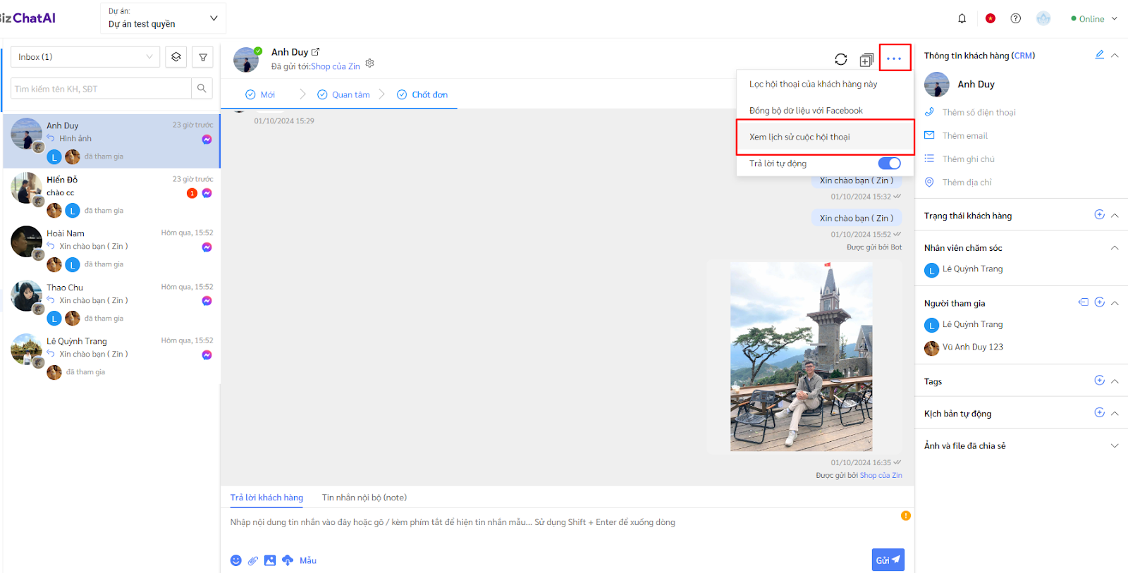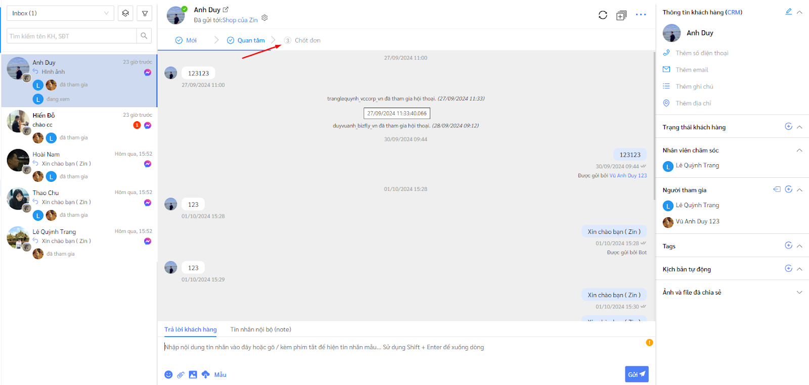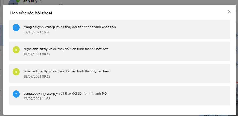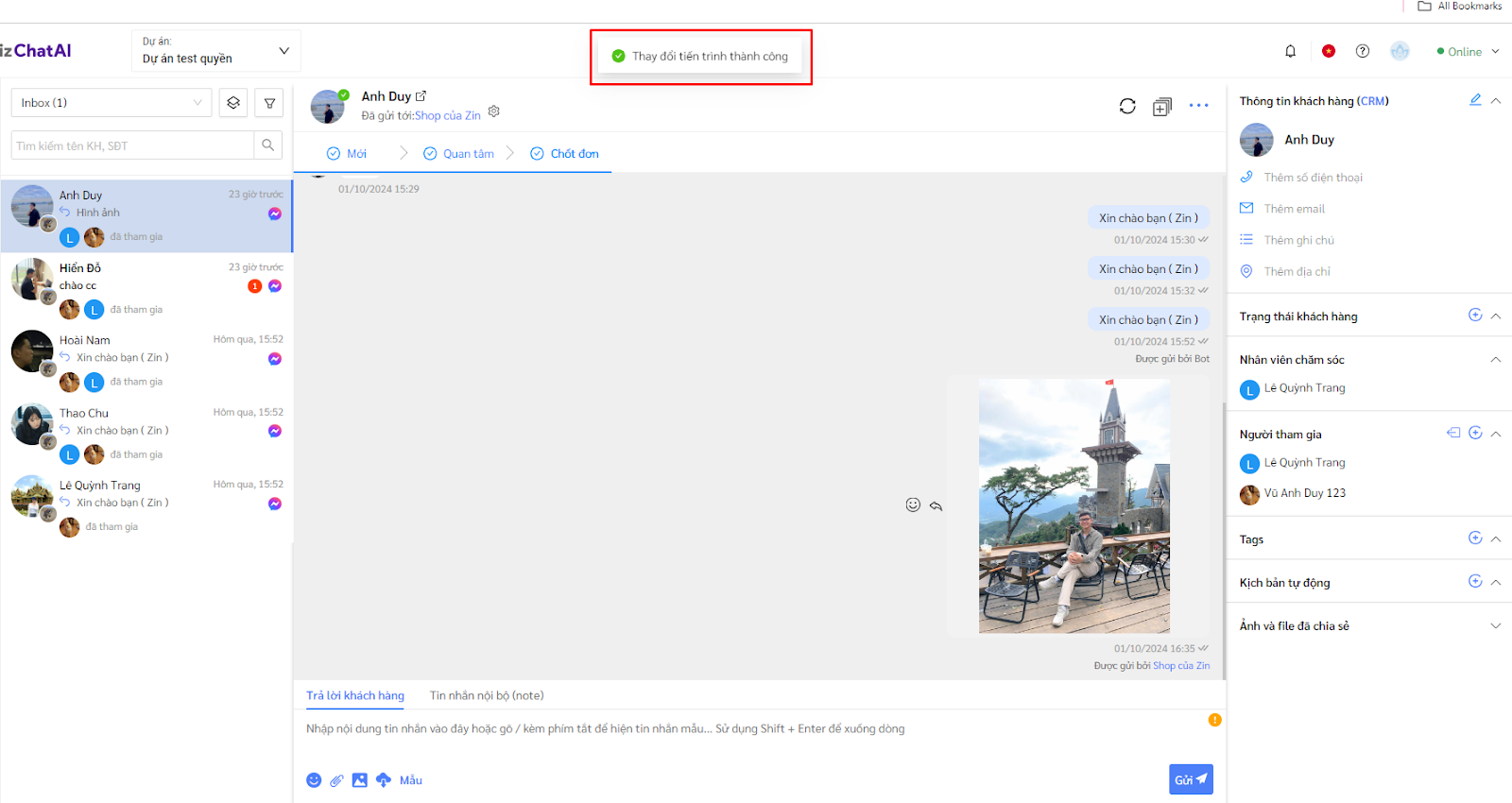 Bước 3: Hiển thị thông báo Thay đổi tiến trình thành công đồng thời lưu lịch sử thay đổi tại Lịch sử cuộc hội thoại