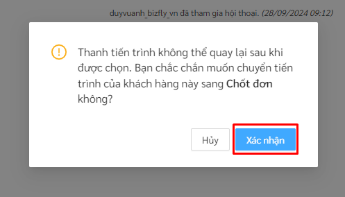 Bước 2: Nhấn Xác nhận để chuyển tiến trình của hội thoại