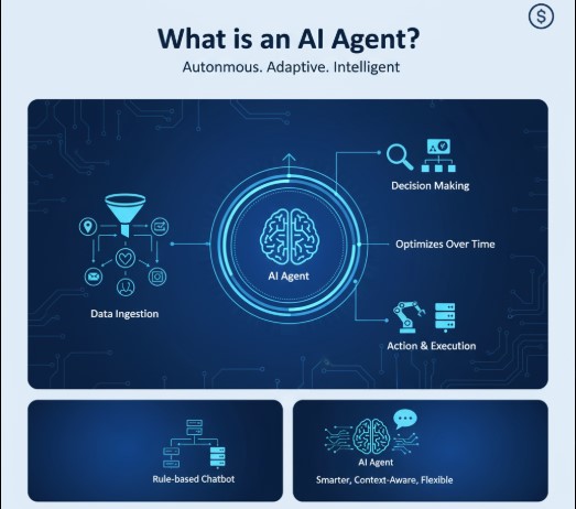 AI Agent (tác nhân AI) là một hệ thống phần mềm hoặc thiết bị được trang bị trí tuệ nhân tạo để nhận thức môi trường → suy nghĩ/ra quyết định → hành động → học hỏi nhằm đạt một mục tiêu cụ thể. Khác với các chương trình thuần quy tắc, AI Agent có thể vận hành độc lập, thích ứng theo ngữ cảnh và cải thiện hiệu suất theo thời gian.