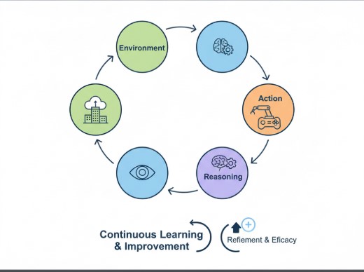 Quy trình Environment → Perception → Reasoning → Action diễn ra liên tục theo vòng lặp. Sau mỗi lần tương tác, AI Agent học hỏi và cải thiện chất lượng phản hồi, giúp ngày càng chính xác và hiệu quả hơn.