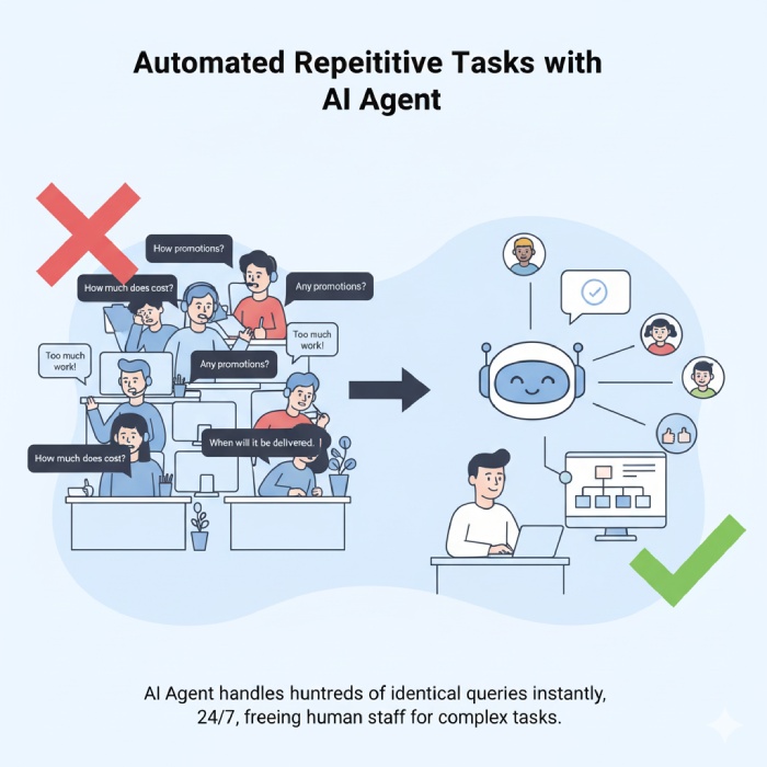 Với AI Agent, các quy trình lặp lại này được tự động hóa hoàn toàn. Hệ thống có thể tiếp nhận và phản hồi tức thì 24/7, đảm bảo không bỏ sót khách hàng nào, đồng thời giảm áp lực cho đội ngũ nhân sự.
