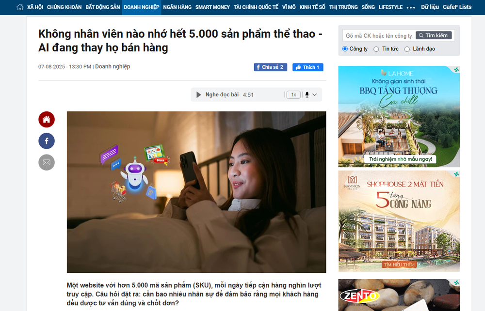 Trên CafeF và Người Đưa Tin, loạt bài viết “Không nhân viên nào nhớ hết 5.000 sản phẩm thể thao – AI đang thay họ bán hàng” thu hút nhiều sự chú ý. Bài báo chỉ ra, với hàng nghìn sản phẩm cùng biến thể kích cỡ, màu sắc, việc ghi nhớ toàn bộ dữ liệu và tư vấn chính xác gần như là bất khả thi với con người.