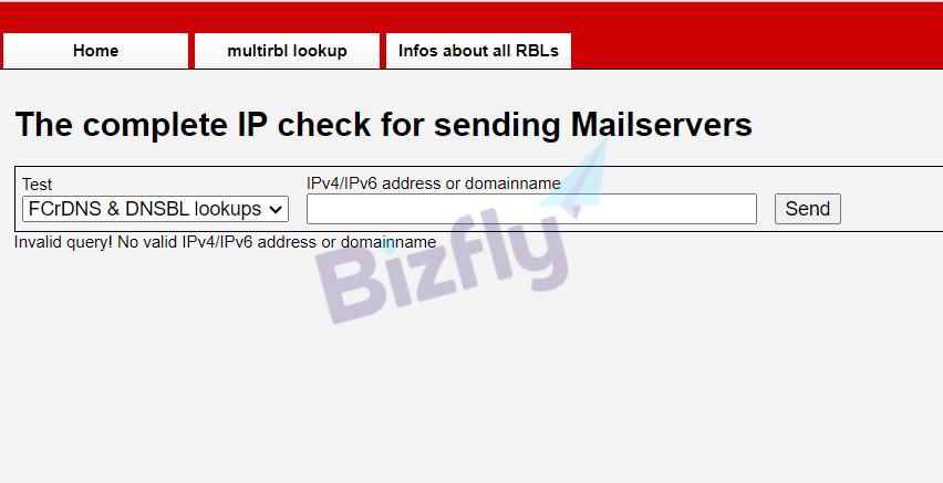 - Bước 2: Ngay tại ô “Test” chọn “FCrDNS & DNSBL lookups”. Tại ô IPv4/IPv6 address or domain name, nhập domain của doanh nghiệp và nhấn “Send”