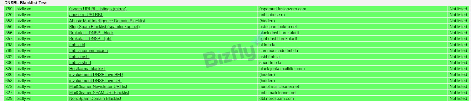 - Bước 3: Thông qua màu sắc, doanh nghiệp có thể xác định domain của mình có bị liệt vào blacklist hay không. Màu xanh là domain không bị liệt vào blacklist của tổ chức chống spam