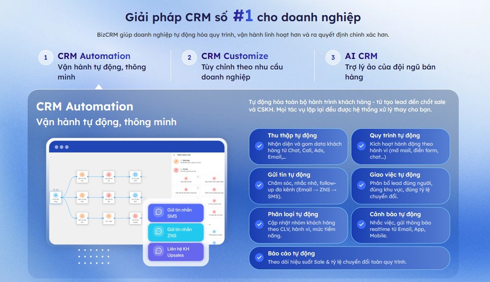 - Automation có kiểm soát, gắn với dữ liệu và mục tiêu kinh doanh: BizCRM không chạy automation theo kịch bản cứng nhắc. Các luồng tự động hóa được xây dựng dựa trên dữ liệu sạch, điều kiện rõ ràng và có cơ chế giám sát, giúp doanh nghiệp đo lường hiệu quả và tối ưu liên tục.