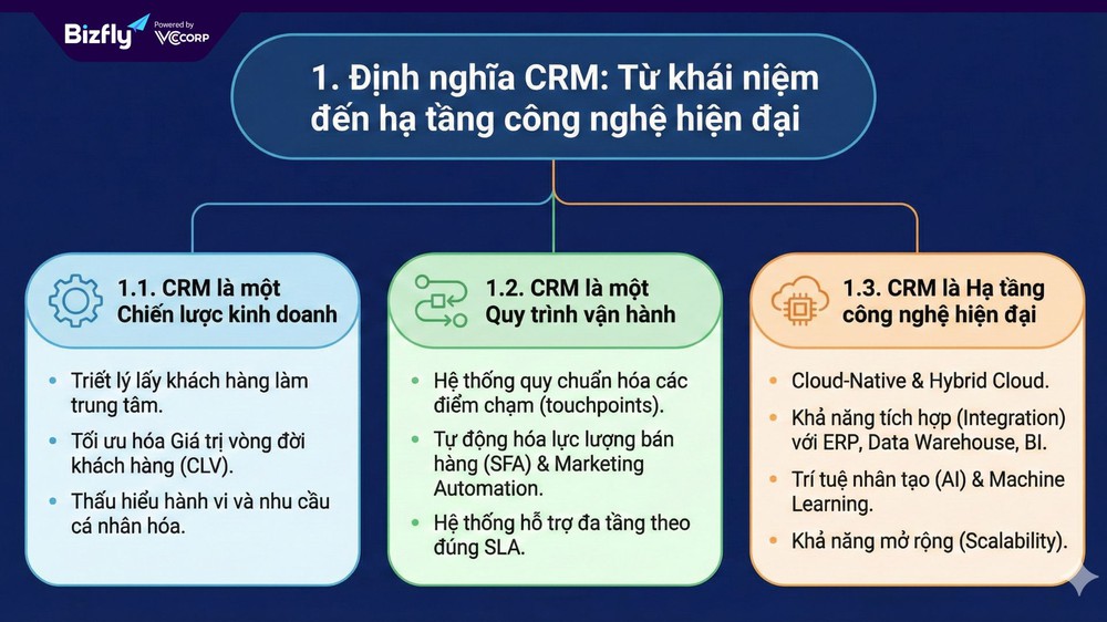 Tuy nhiên, trong kỷ nguyên dữ liệu hiện nay, định nghĩa về CRM đã vượt xa khỏi một "cuốn sổ danh bạ số". Để hiểu đúng về CRM ở quy mô doanh nghiệp lớn, chúng ta cần bóc tách nó qua ba lớp lăng kính: Chiến lược, Quy trình và Công nghệ.