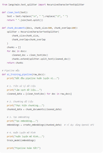 - Cuối cùng pipeline sẽ gọi mô hình huấn luyện hoặc fine-tune dựa trên dữ liệu chunked.