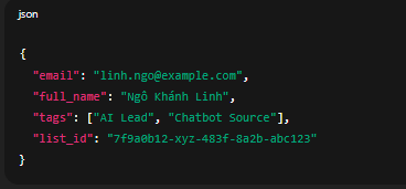 - Automation Layer: Hệ thống Automation Marketing (Mailchimp, HubSpot, BizMail, BizCRM…) nhận lệnh, tạo hoặc cập nhật contact.