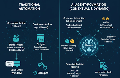 Trước đây, các nền tảng Automation Marketing như BizMail hay HubSpot thường hoạt động dựa trên trigger tĩnh (ví dụ: khi khách hàng điền form, hệ thống gửi email). Nhưng khi kết hợp với AI Agent, toàn bộ quá trình này trở nên động và có ngữ cảnh hơn.