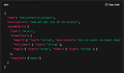 AI Agent được huấn luyện với function add_contact_to_bizmail(contact) và send_campaign_email(contact_id, campaign_id) để hiểu khi nào cần gọi API. Ví dụ schema định nghĩa function (cho OpenAI hoặc Ollama Function Calling):