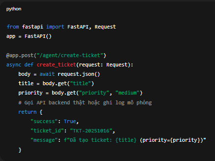 → Agent phản hồi: “Tôi đã tạo ticket #TKT-3021, bạn có muốn cập nhật thêm chi tiết không?”
