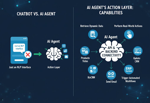 Một AI Agent chỉ thực sự sống khi nó có thể giao tiếp với các hệ thống khác từ CRM, ERP, CMS đến ứng dụng nội bộ. Nếu chỉ dừng lại ở mức chatbot trả lời, Agent không khác gì một giao diện NLP. Nhờ kết nối API và backend, Agent có thể: