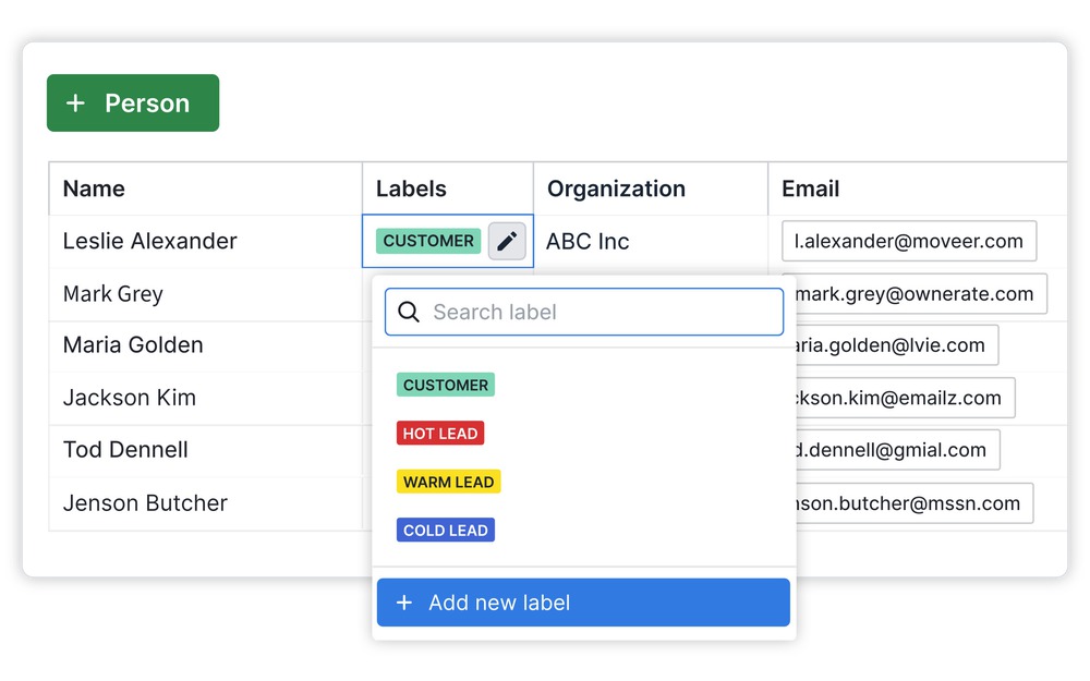 Mỗi khách hàng trong Pipedrive đều có một hồ sơ đầy đủ với tên, email, số điện thoại, công ty, ghi chú, nguồn khách hàng… cùng toàn bộ lịch sử liên lạc như email, cuộc gọi, cuộc họp. Điều này giúp đội ngũ Sales không phải ghi nhớ thủ công và dễ dàng bàn giao khách hàng giữa các nhân viên mà không bị gián đoạn chăm sóc.