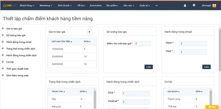 - Chấm điểm tiềm năng (Lead Scoring): Tự động chấm điểm dựa trên hành vi của khách (mở mail, click link, vào web) để Sale ưu tiên chăm sóc những người có khả năng chốt đơn cao nhất.