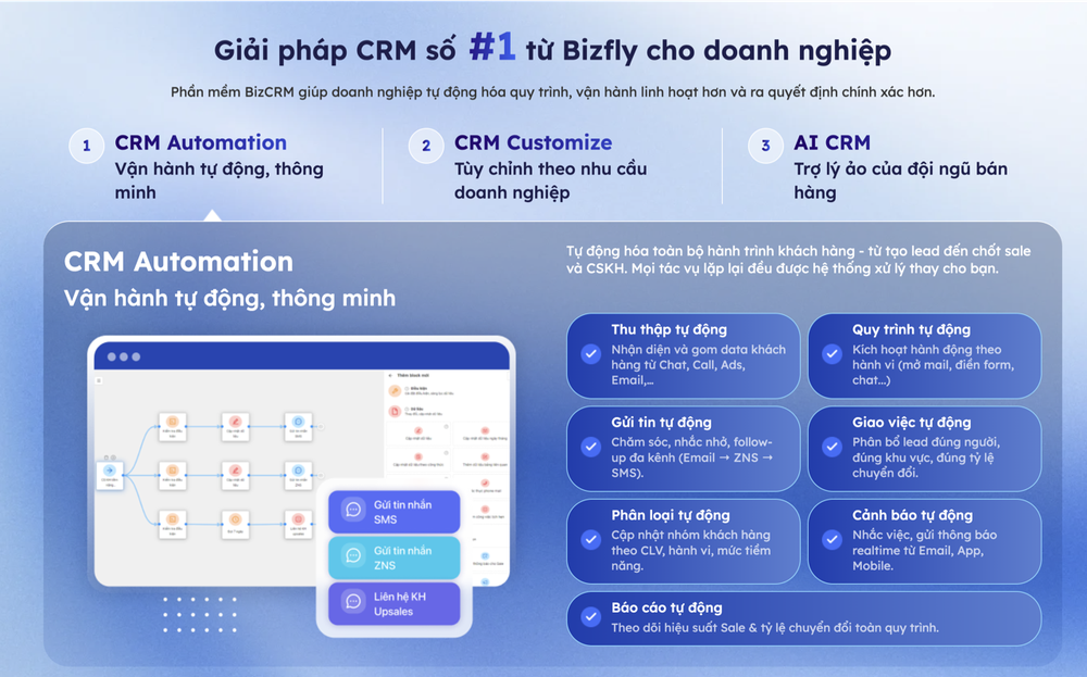 InsightlyCRM chưa thực sự mạnh trong việc triển khai marketing automation đa kênh. BizCRM giải quyết bài toán này bằng cách tích hợp nhiều kênh giao tiếp trong một hệ thống duy nhất. Doanh nghiệp có thể: