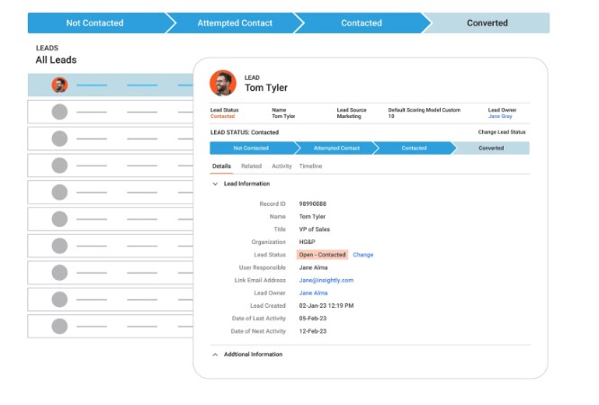 Một chức năng cốt lõi của Insightly CRM là quản lý thông tin khách hàng và khách hàng tiềm năng. Hệ thống cho phép doanh nghiệp lưu trữ chi tiết dữ liệu khách hàng như thông tin liên hệ, doanh nghiệp, vị trí công việc cũng như lịch sử tương tác.