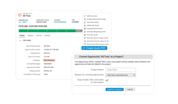 Có thể chuyển cơ hội bán hàng thành dự án và theo dõi tiến độ ngay trong CRM |