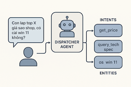 Yêu cầu từ người dùng đi vào một Dispatcher Agent. Agent này không chỉ là một NLU service đơn thuần mà còn hoạt động như một API Gateway.