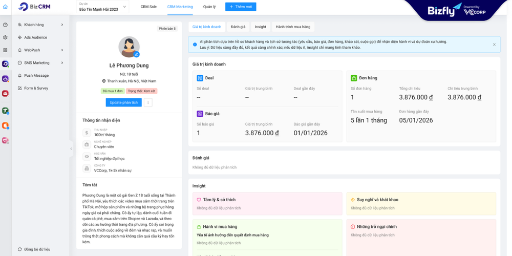 - Phân tích chuyên sâu: Hệ thống tự động tổng hợp từ lịch sử mua hàng, hành vi tương tác và khảo sát để vẽ ra bức tranh chân dung chi tiết.